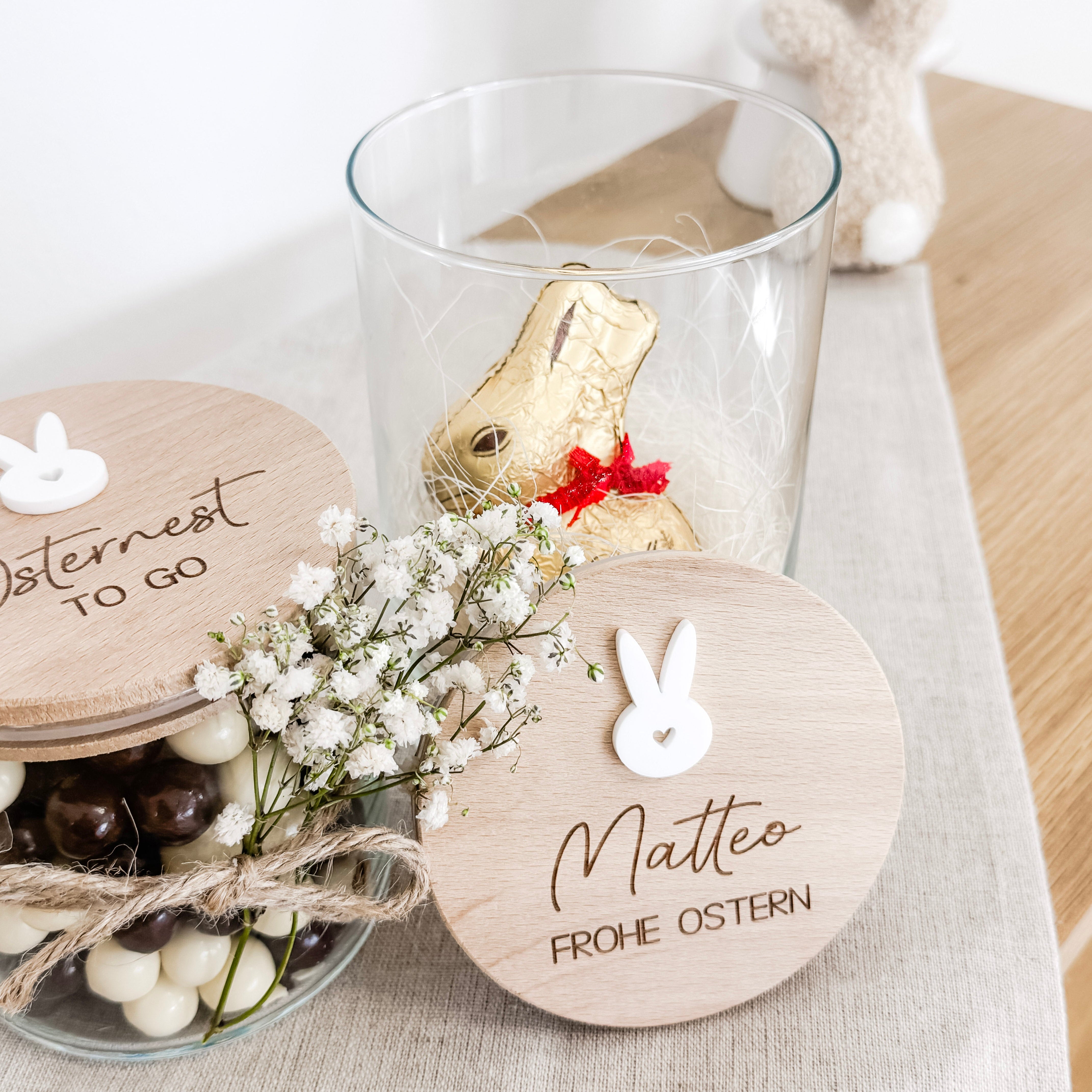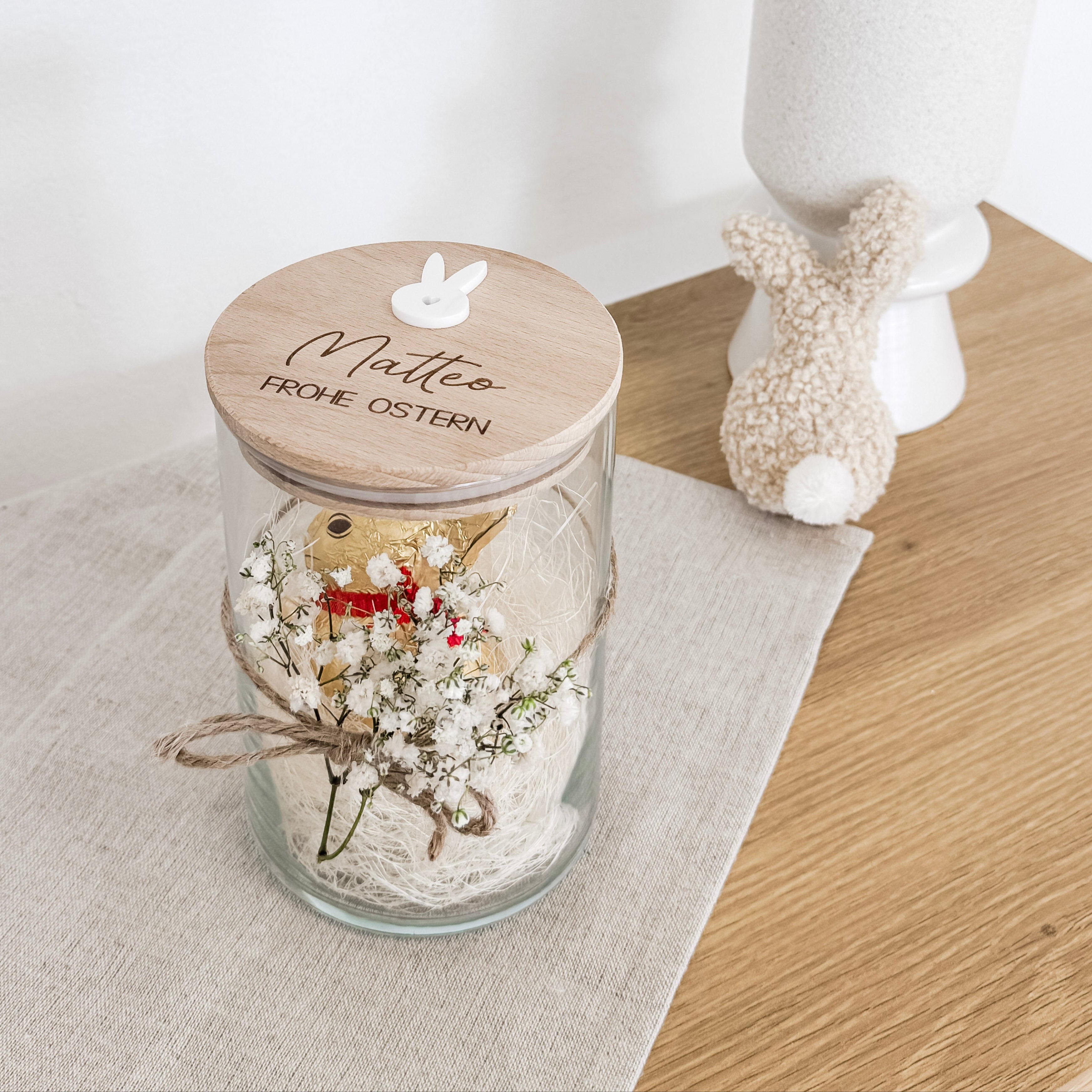 Perfekt als Geschenk für Teenager, Kinder & Erwachsene zu Ostern! Das Glas wird mit deinem Wunschnamen und "Frohe Ostern" graviert und hat ein niedliches Hasenmotiv aus Acryl auf dem Deckel. Ideal als Mitbringsel zur Eiersuche, für Süßigkeiten oder als stilvolle Osterdeko.