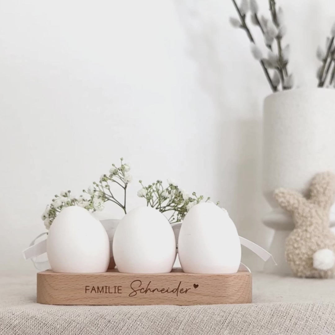 Unser personalisiertes Eiertablett sorgt dafür, dass deine Eier nicht mehr wild auf dem Tisch herumrollen, sondern sicher & schick serviert werden. Ob zum Sonntagsfrühstück oder Osterbrunch mit deinen Lieblingsmenschen - deine Gäste werden von dieser schönen & praktischen Tischdeko begeistert sein.
