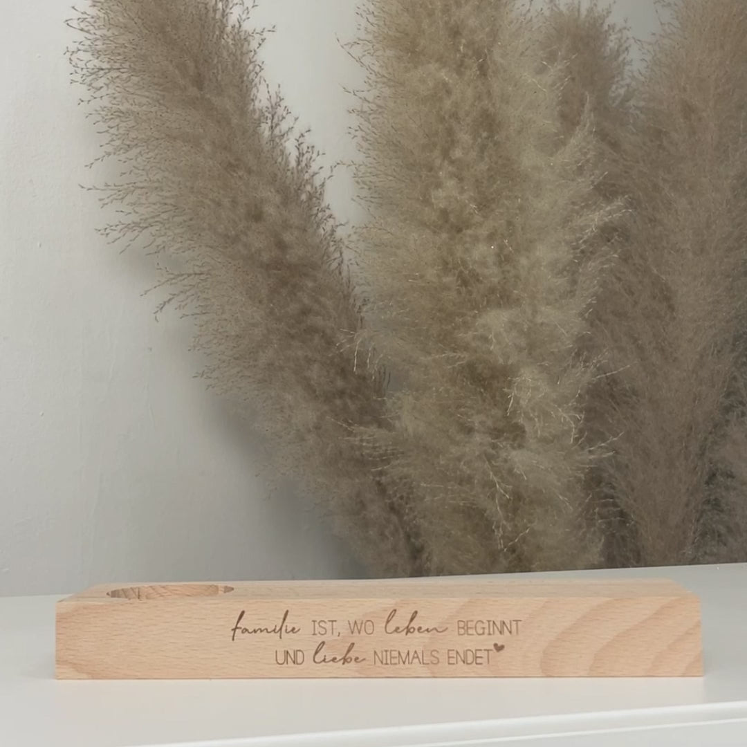 Unser Kartenständer ist nicht nur ein stilvolles Deko-Element für dein Zuhause, sondern auch eine wundervolle Möglichkeit, Erinnerungen festzuhalten. Mit dem eingravierten Spruch "Familie ist, wo das Leben beginnt und die Liebe niemals endet" symbolisiert er die bedingungslose Verbundenheit zwischen den Generationen.