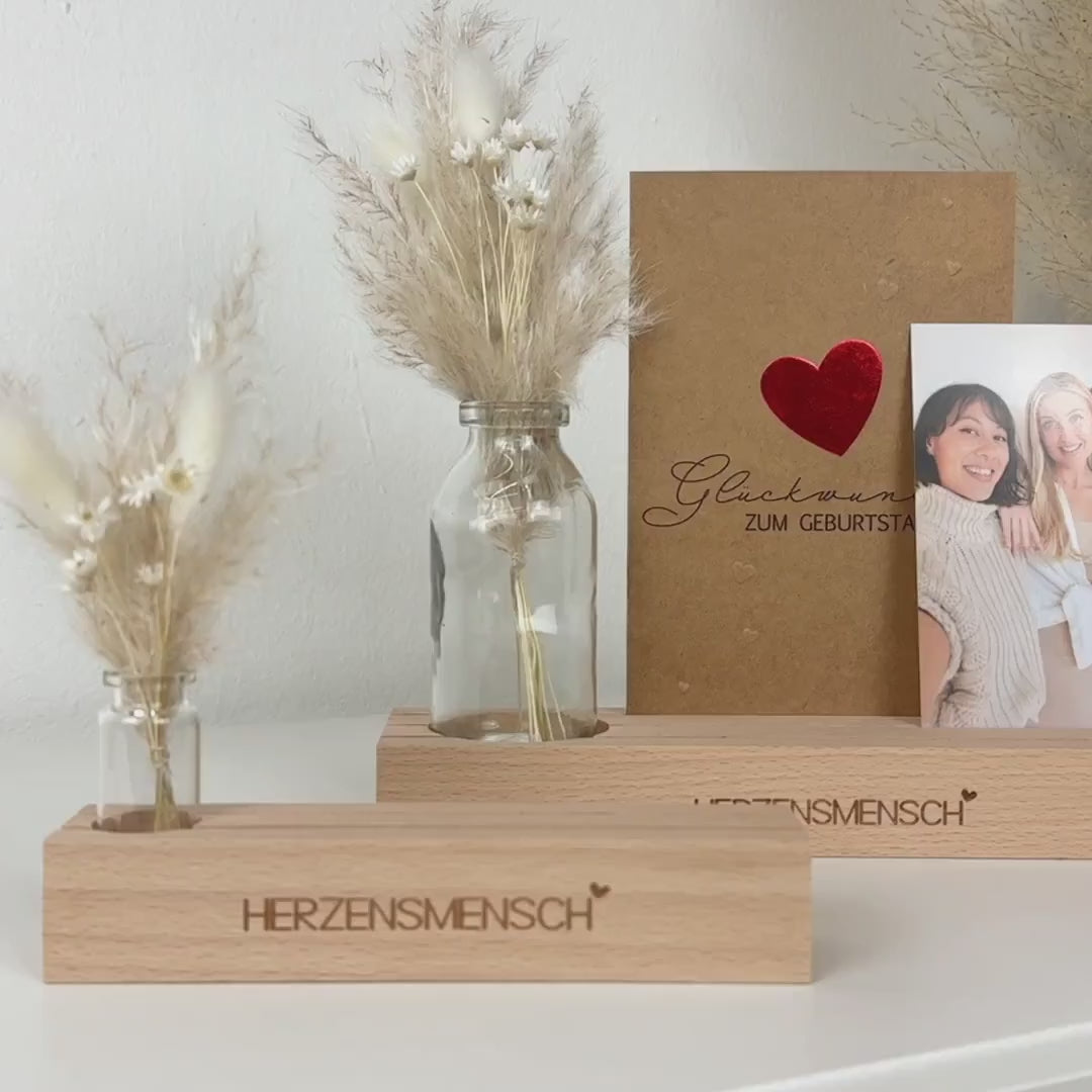 Du suchst ein persönliches Geschenk? Etwas, das ein Lächeln ins Gesicht zaubert und Augen zum Leuchten bringt? Dann haben wir genau das Richtige für dich: Unser Holzständer für Karten und Fotos mit der Gravur "Herzensmensch". Egal ob für deine liebste Freundin, Partner oder einem anderen ganz besonderen Menschen - dem du eine Freude machen möchtest.