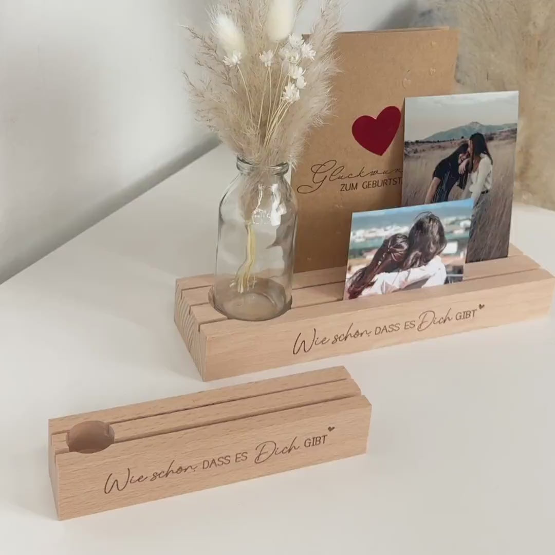Du suchst ein persönliches Geschenk für deine Liebsten? Egal ob für deine beste Freundin, Mama oder Oma, eine tolle Kollegin oder den Partner. Wir haben genau das Richtige für dich: Unser Holzständer für Karten und Fotos mit dem süßen Spruch "Wie schön, dass es dich gibt". Eine Karte und Fotos mit tollen Momenten rein und schon ist das Geschenk ein toller Hingucker.