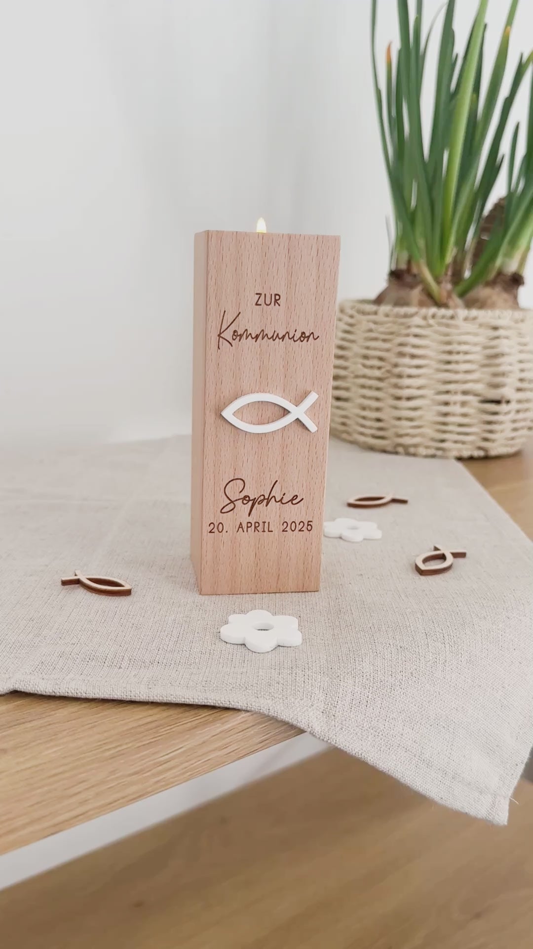 Mit einer individuellen Gravur des Namens, Anlasses & Datums sowie einem edlen 3D-Fisch aus weißem Acryl wird dieser Teelichthalter zu einem bedeutungsvollen Andenken an diesen besonderen Tag. Das christliche Fischsymbol steht für Glauben und Hoffnung – perfekt als Geschenk zur Taufe, Erstkommunion oder Konfirmation.